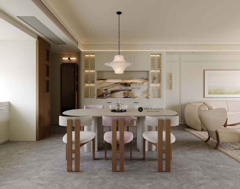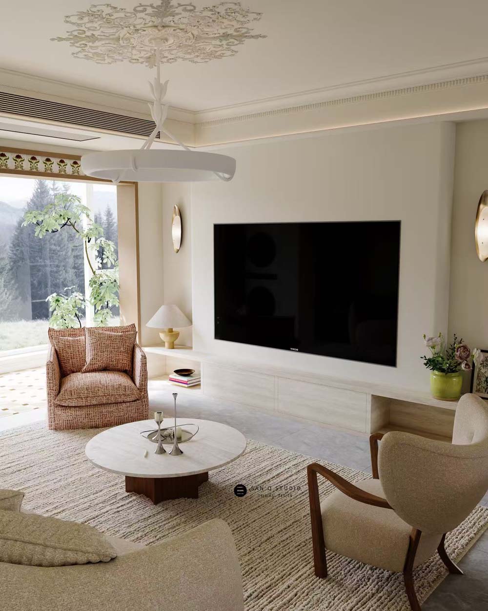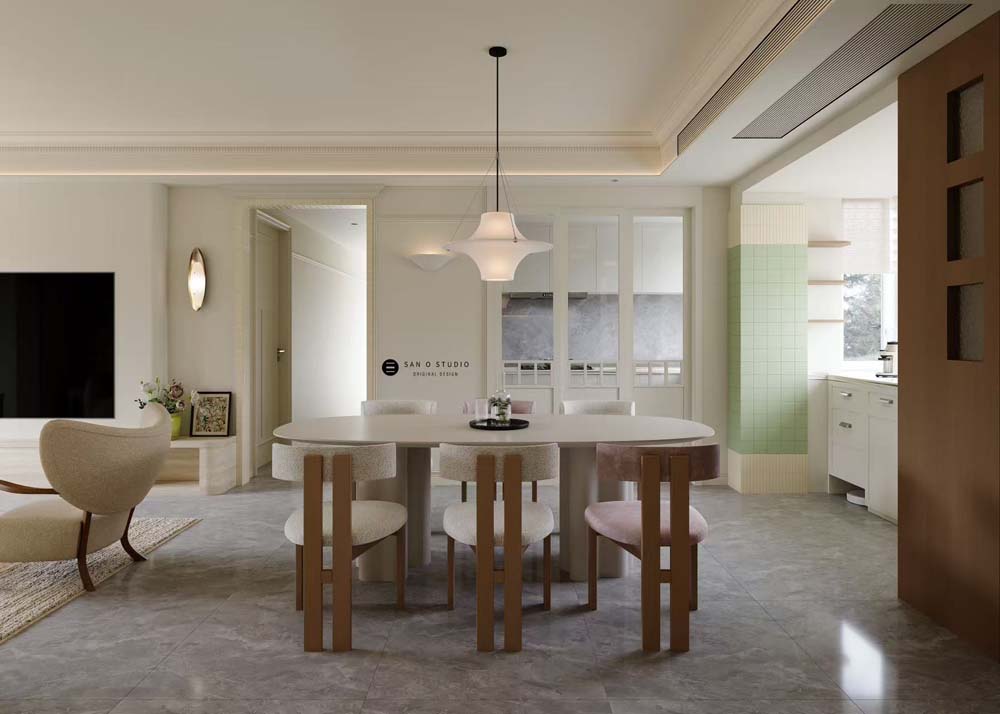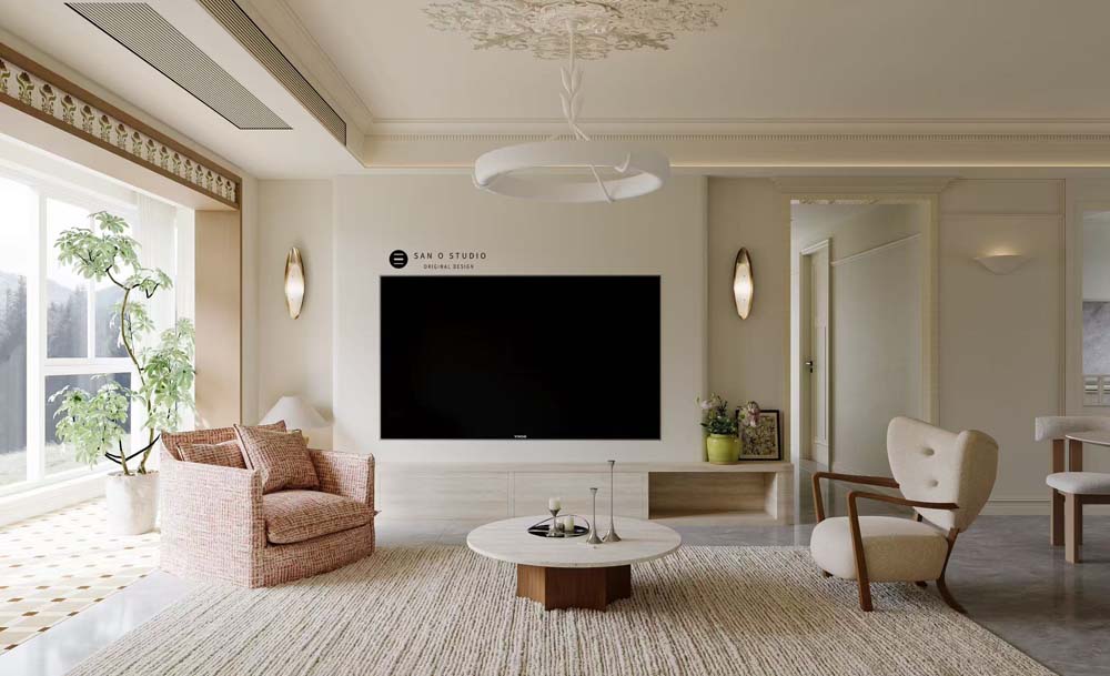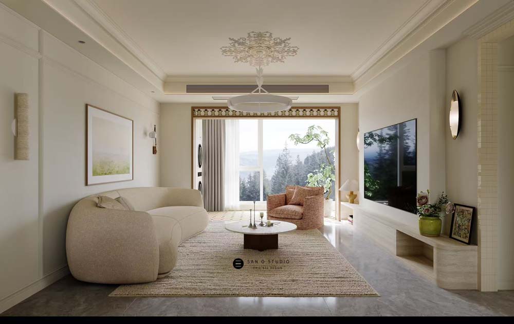 设计描述:本房屋属于开发商精装交付,局部改造及风格打造;顶面增加PU线条,灯盘,铝合金极窄灯带;墙面增加门洞造型,PU线条装饰;地面,更换阳台原有地面为200*200花砖;在一成不变的精装房中,找到自己想要的风格;家是自己独有的空间,也是隐私空间;每个细节,都随自己喜欢去选择。