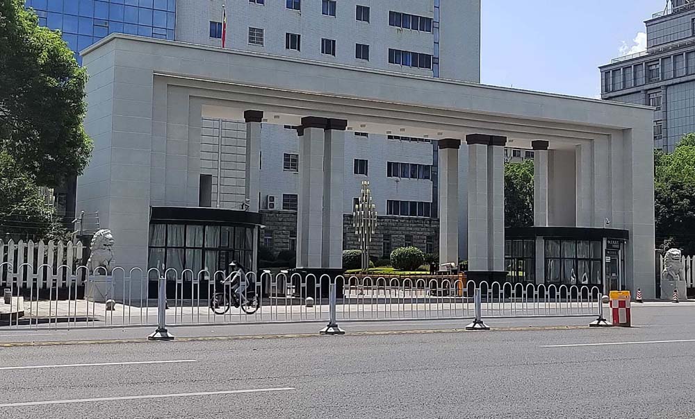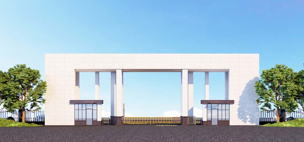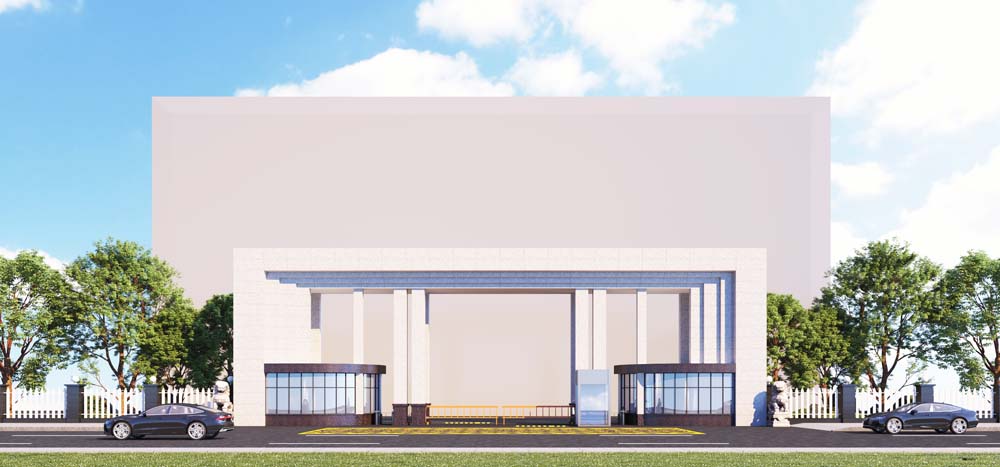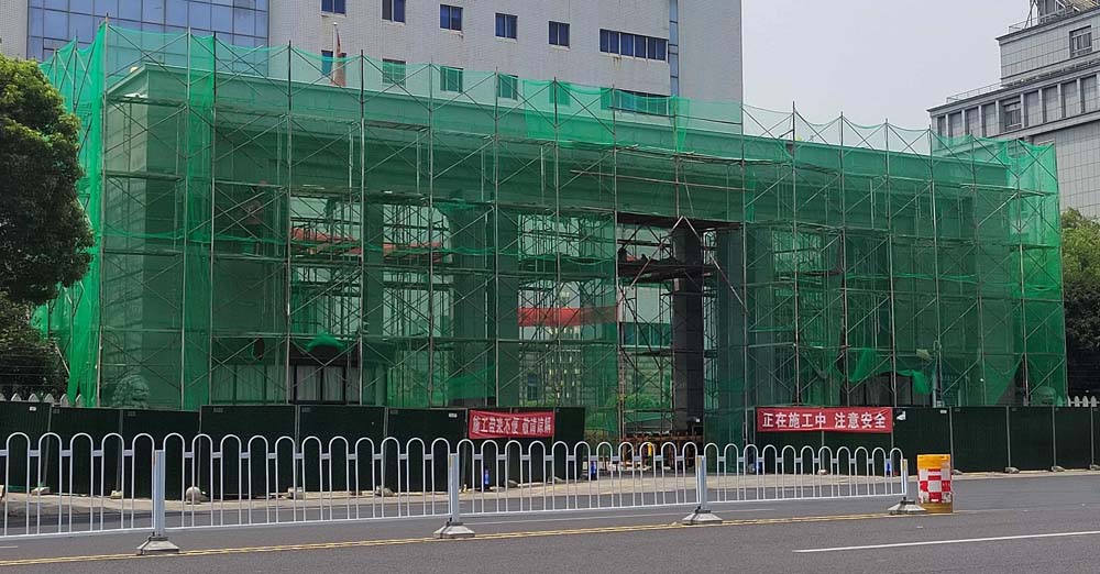 原门头十米高,刚挂大理石;由于装修时间比较长,局部大理石开始脱落;为安全起见,拆除原有所有钢挂大理石,新做深槽仿石漆。考虑施工高度,满堂钢管脚手架,满挂安全网,并留临时出入口。